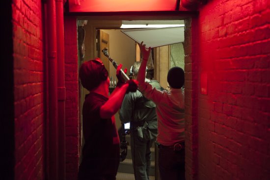El operador de boom Brendan O’Brien trabajando en un angosto pasillo. (Foto: Atsushi Nishijima)