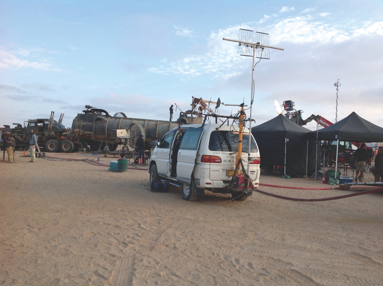 Ben Osmo: “Hay ocho actores principales dentro de la cabina del T8-15, todos con transmisores Lectrosonics SMV o SMQV e inalámbricos DPA 4063. Teníamos una antena escondida dentro de la cabina con un cable coaxial que iba directamente al interior del tanque del camión cisterna. En un estuche rígido escondido dentro de ese tanque había dos receptores Venue de Lectrosonics con 12 salidas que, a su vez, iban a 12 transmisores UM400. La salida RF se multiplexaba a un amplificador/combinador de RF diseñado especialmente por el ingeniero Glen English, en la ciudad de Canberra. El cable coaxial luego viajaba a lo alto del tanque cisterna hacia un transmisor aéreo que escondimos en la parte exterior del tanque, dándonos un radio libre de 360°. Todo esto se encontraba en un estuche rígido junto con un UPS de marca Meon. En la parte de atrás del estuche instalamos un sistema de refrigeración, pues las temperaturas superaban los 50°C y había mucho polvo. Al estuche lo bautizamos “Sputnik”. Dentro del camión teníamos un generador de 10kW que alimentaba las luces, los equipos de sonido, y lo que se necesitara de efectos especiales; con eso lográbamos alimentar el Sputnik. Aquí debo hacer una mención de honor a Greg Roberts de Lateral Linking, que nos ayudó tremendamente con eso.”